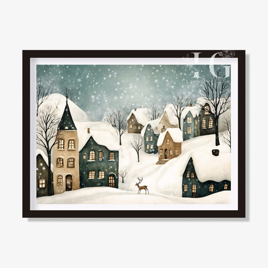 Snowy Christmas Village Art Print - Printable Winter Wall Decor for Holiday Home Aesthetic