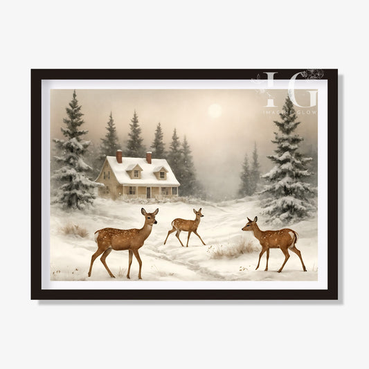 Deer Playing in Snow Art Print - Charming Winter Wall Decor
