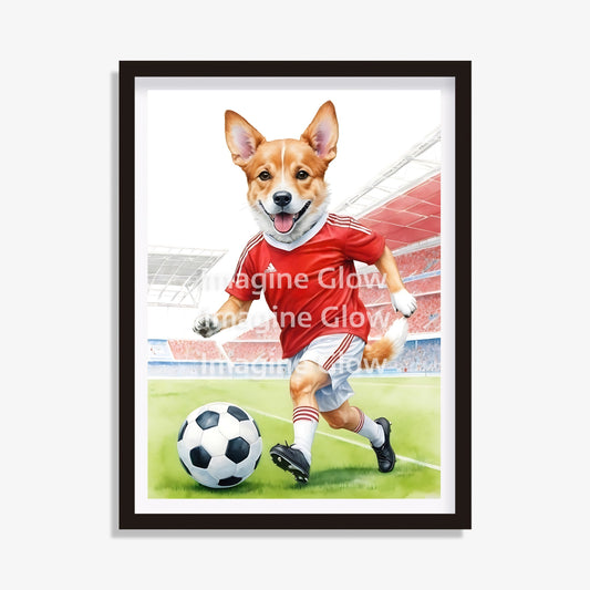 Soccer Art - Red Shirt Dog Playing Football Print - Printable Sport Decor