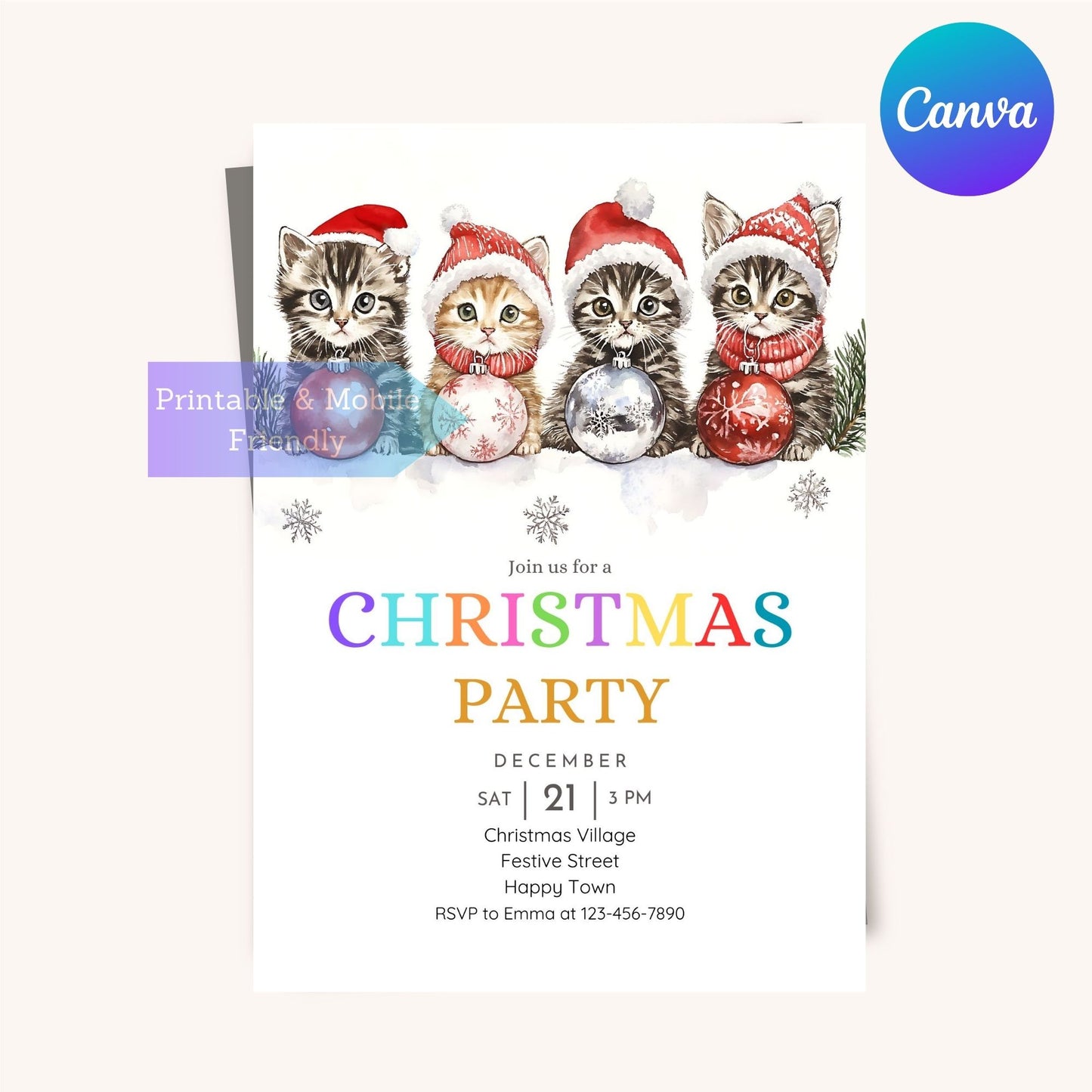 Adorable Kittens Christmas Party Editable Canva Invitation Template