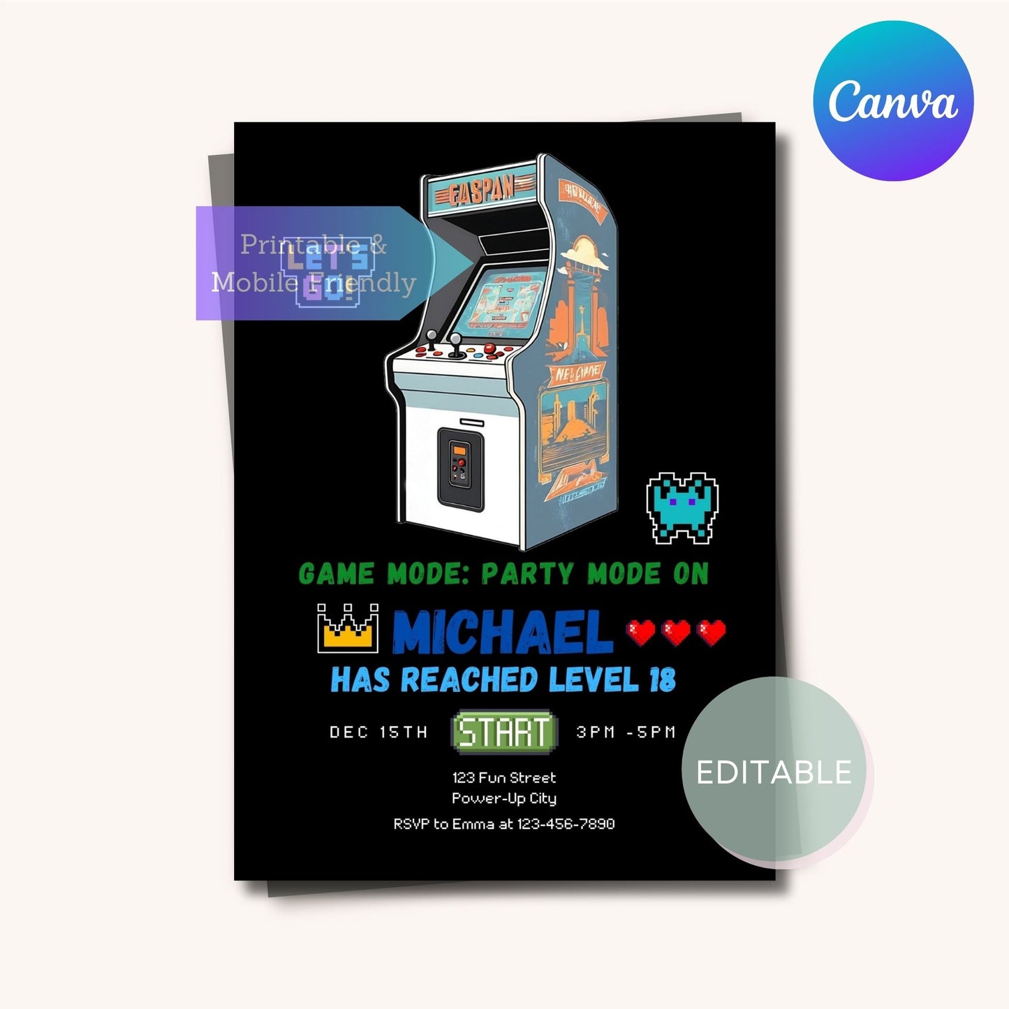 Arcade Invitation Template - Editable Gamer Party Canva Template
