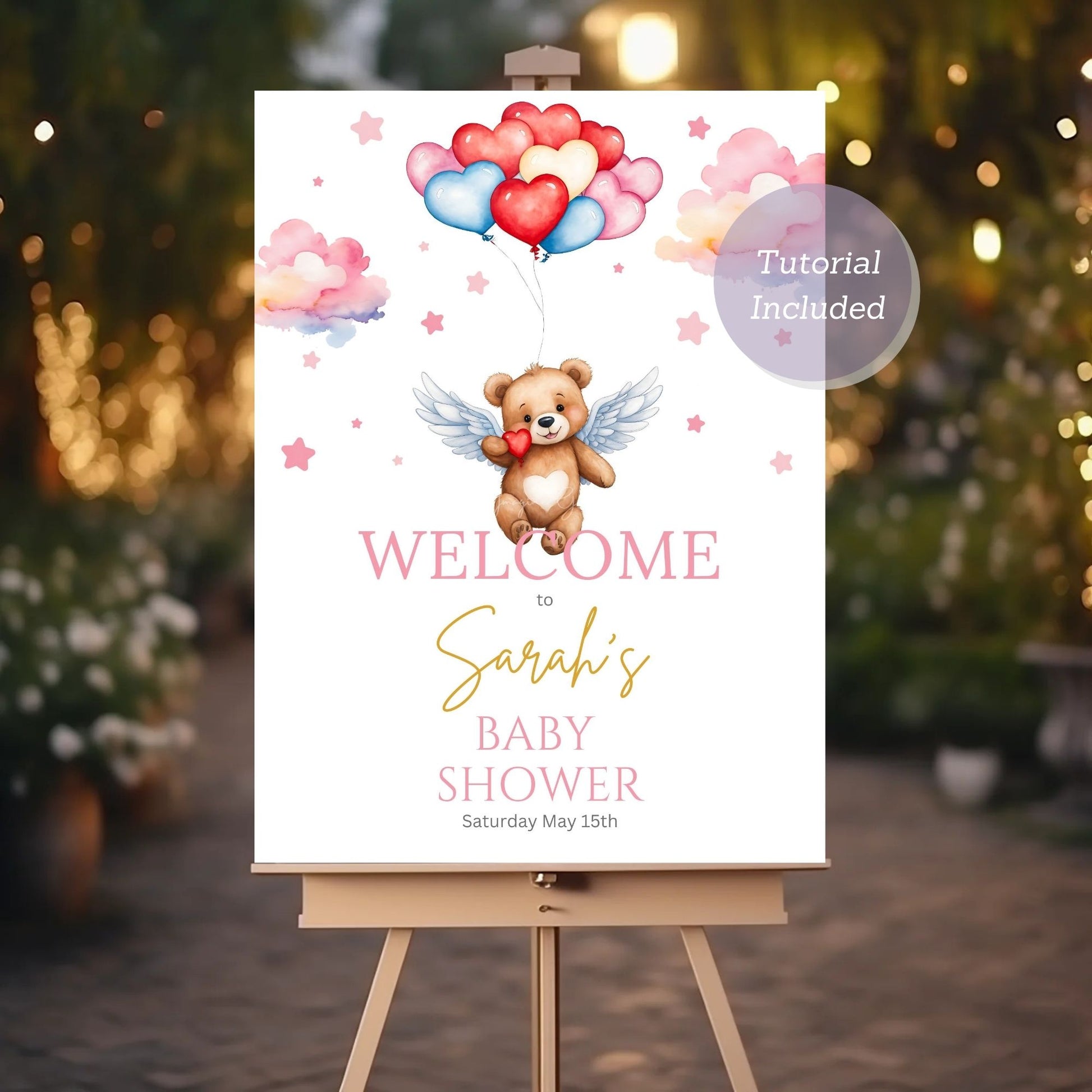 Welcome your guests in style with this charming Bear Baby Shower Welcome Sign, designed with a sweet bear holding angel balloons to create a whimsical and heartwarming atmosphere. Perfect for celebrating a baby girl, this editable and printable template allows you to customize the text to match your party theme effortlessly. Whether you’re hosting a cozy indoor shower or a festive outdoor gathering, this adorable bear-themed poster adds a personalized touch to your decor. Ideal for framing or displaying on an easel, this design is versatile and easy to use, making it a must-have for your special event.