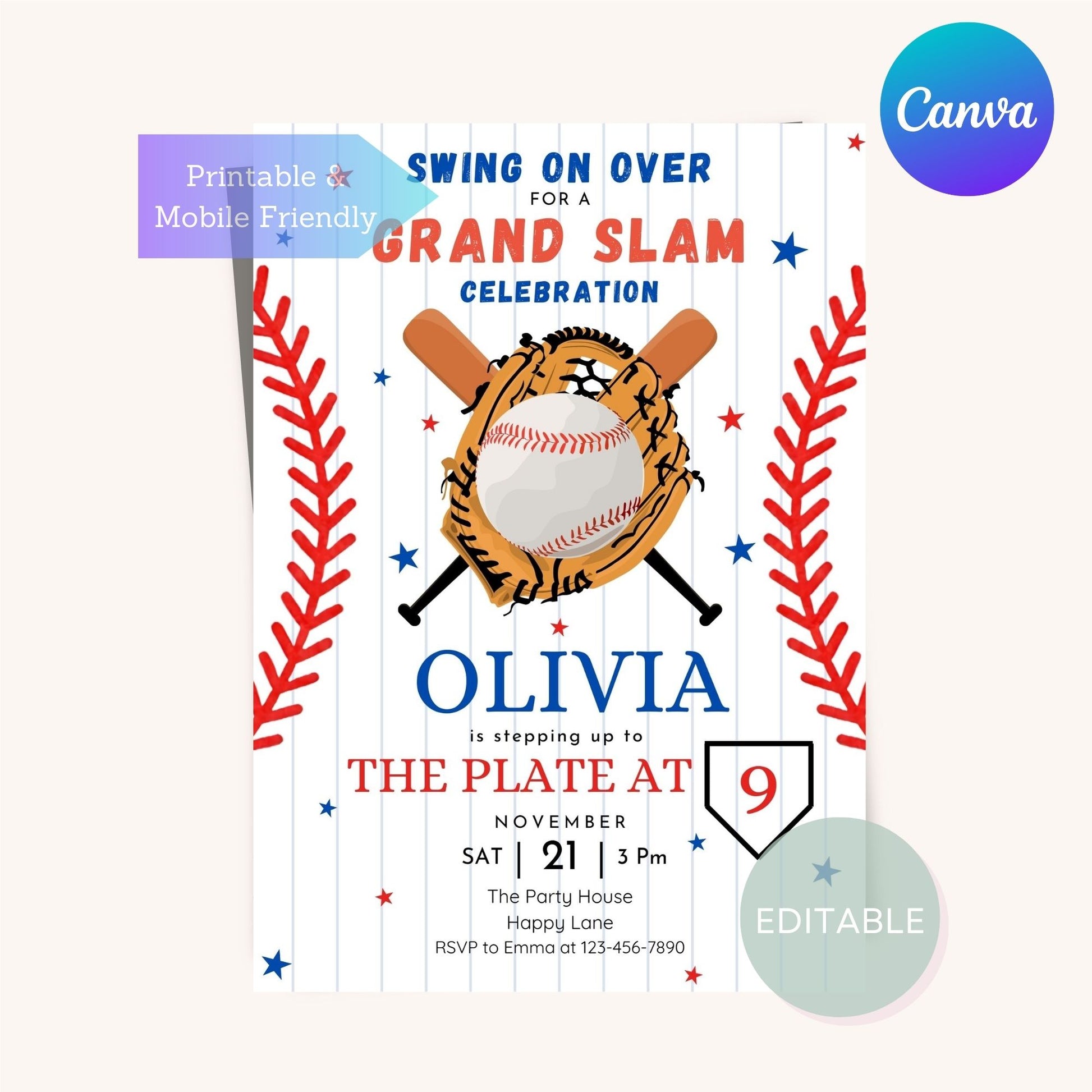 Baseball-Themed Birthday Invitation Template - Editable Party Invites for Kids & Adults - Printable Canva Design