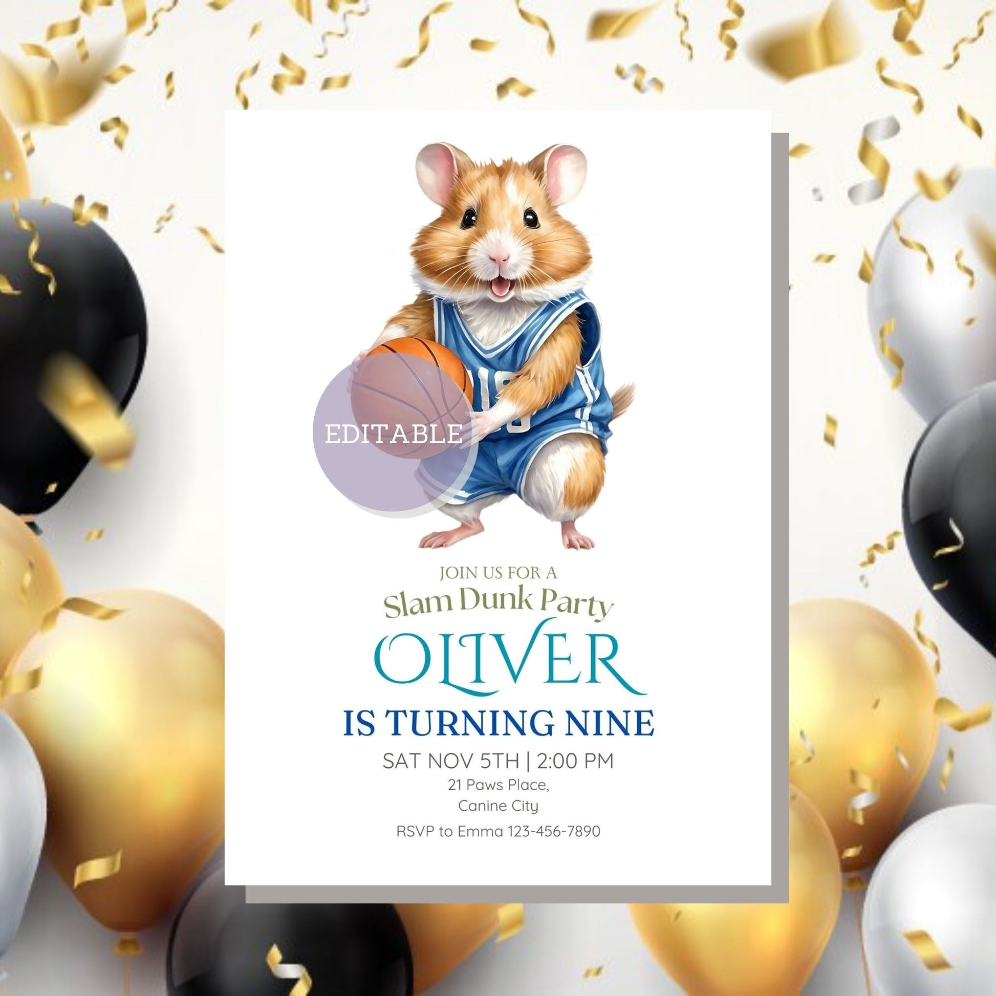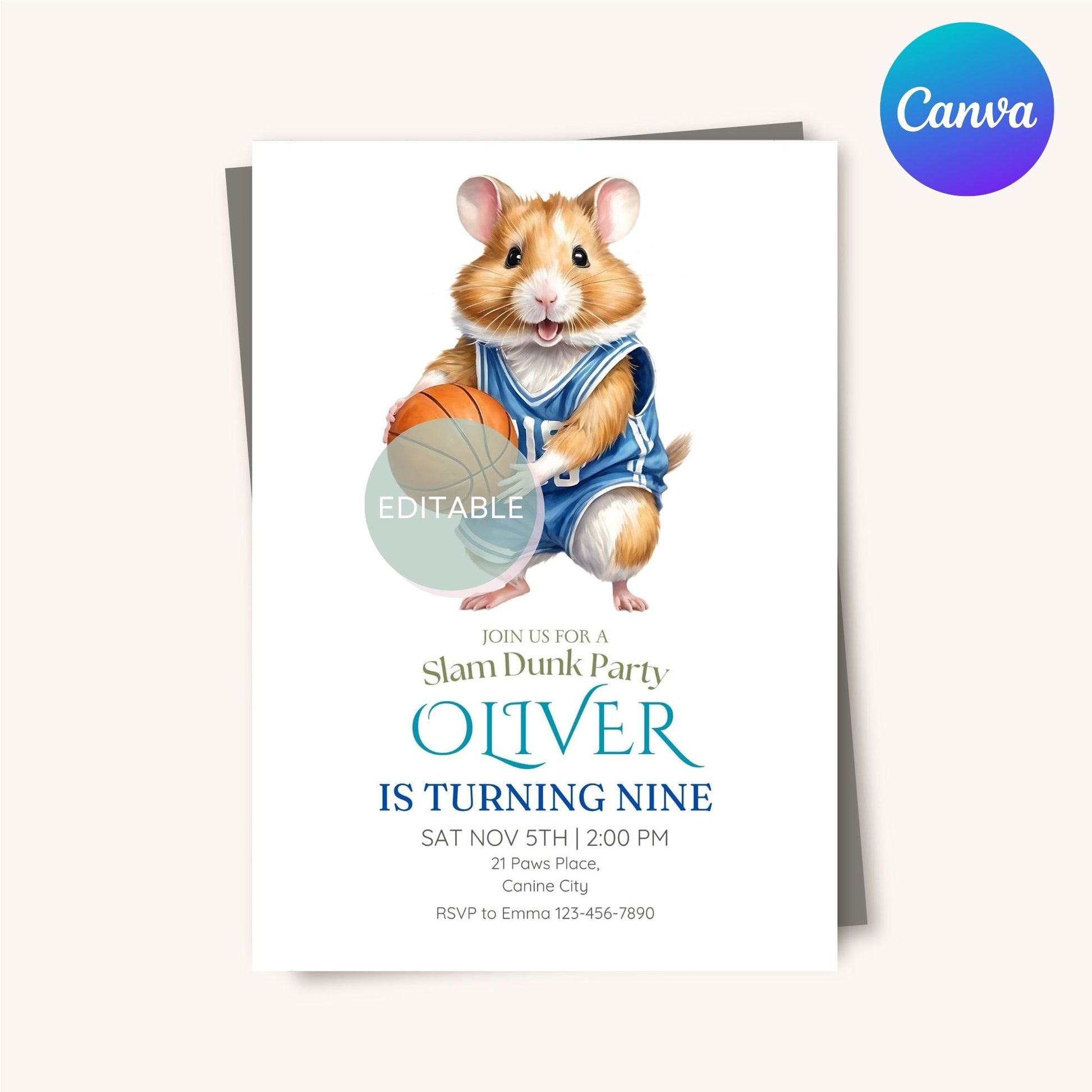 Basketball Birthday Invitation Template - Customizable Hamster theme Party Invite - Printable Canva Design