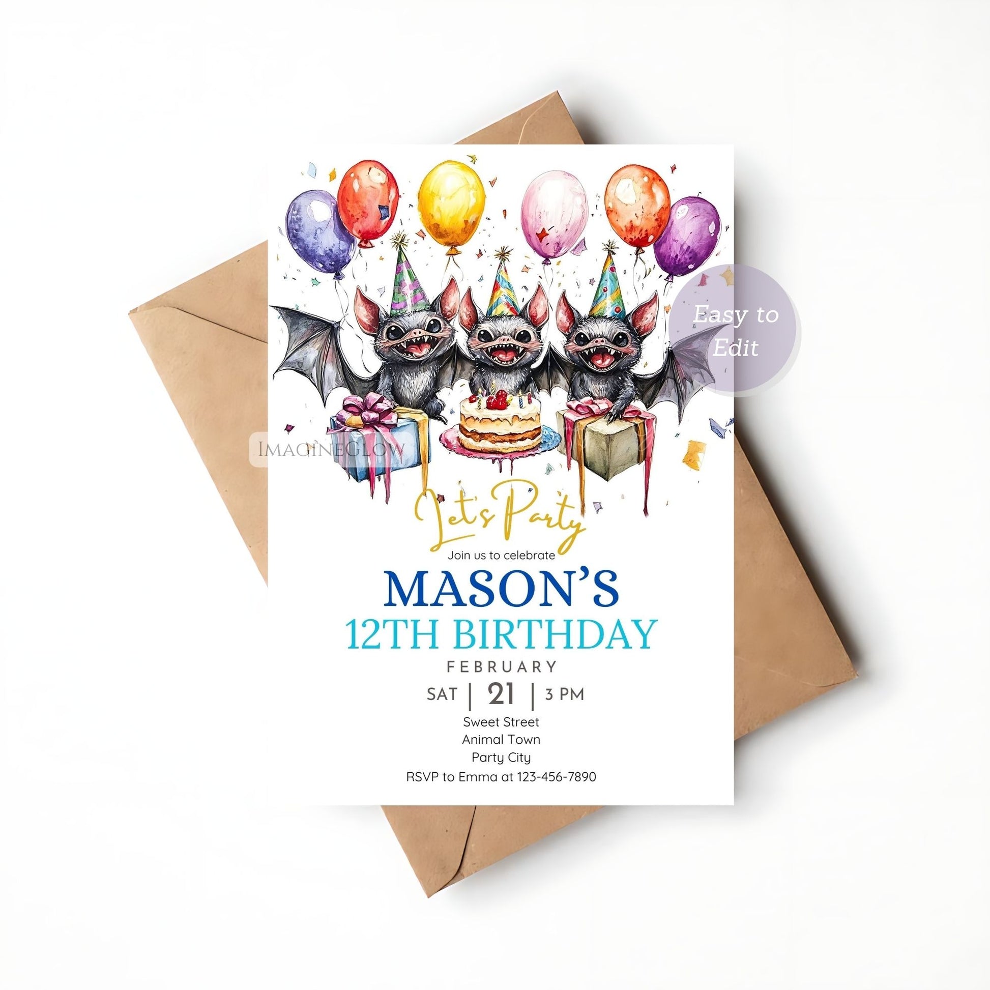 ✔︎ Editable Birthday Invitation featuring a cute bat character, perfect for boys or girls