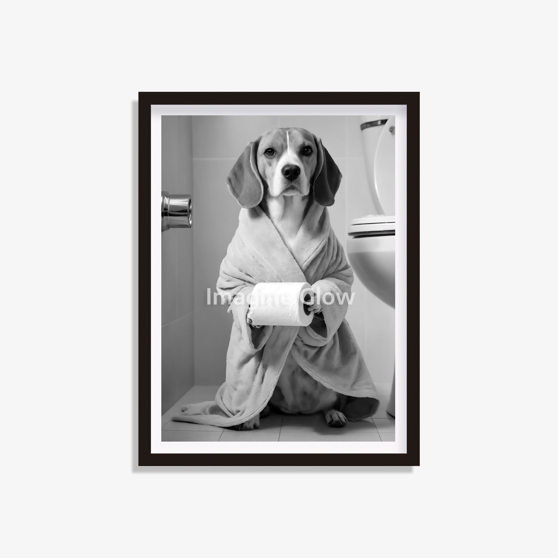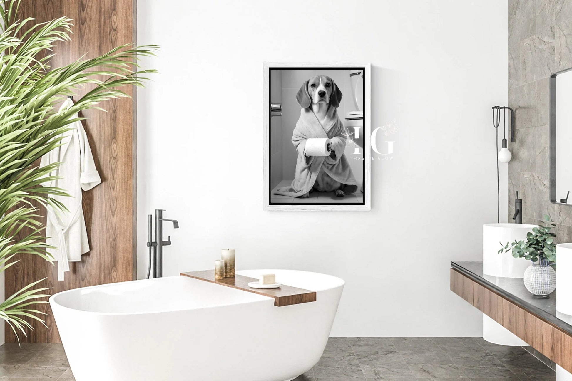 Bring a playful touch to your bathroom with this Beagle dog in bathrobe printable wall art. Ideal for adding a whimsical and charming element to your bathroom decor.