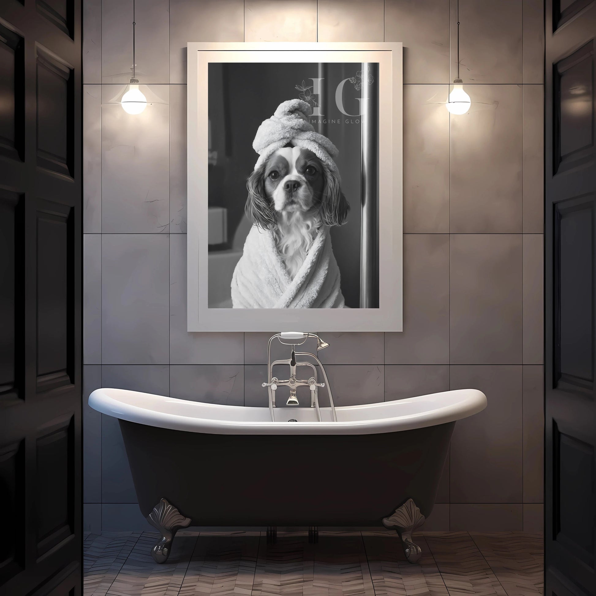 Enhance your bathroom decor with this printable art featuring a Cavalier King Charles Spaniel in a bathrobe. This charming artwork adds a whimsical touch to your bathroom space and is perfect for those who love dog-themed decor.