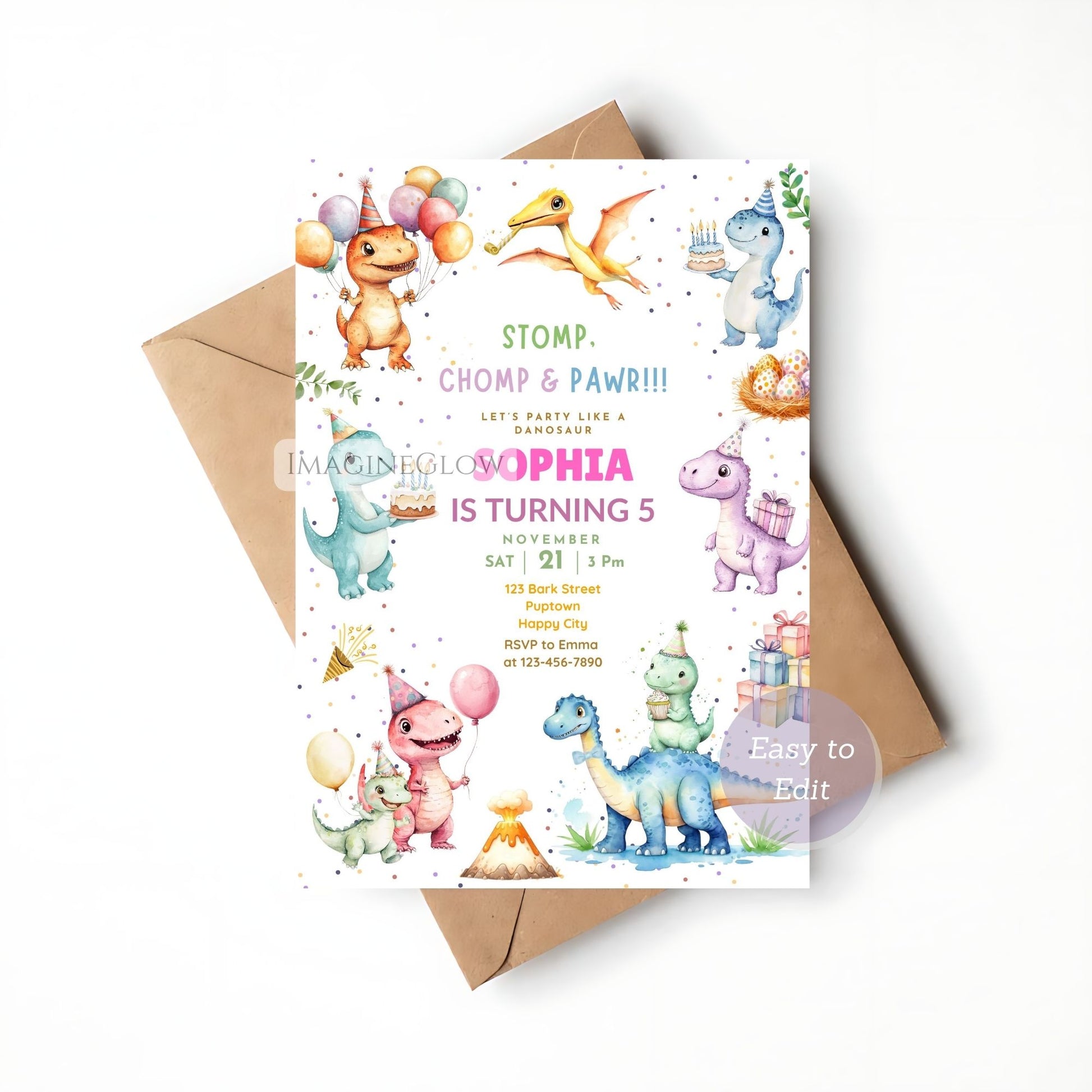 Easy to edit and customize, this invitation can be printed at home or sent digitally to your friends and family, giving you flexibility while maintaining a high-quality look. Make your child's birthday even more special by sending them a fun, editable dinosaur-themed party invite.