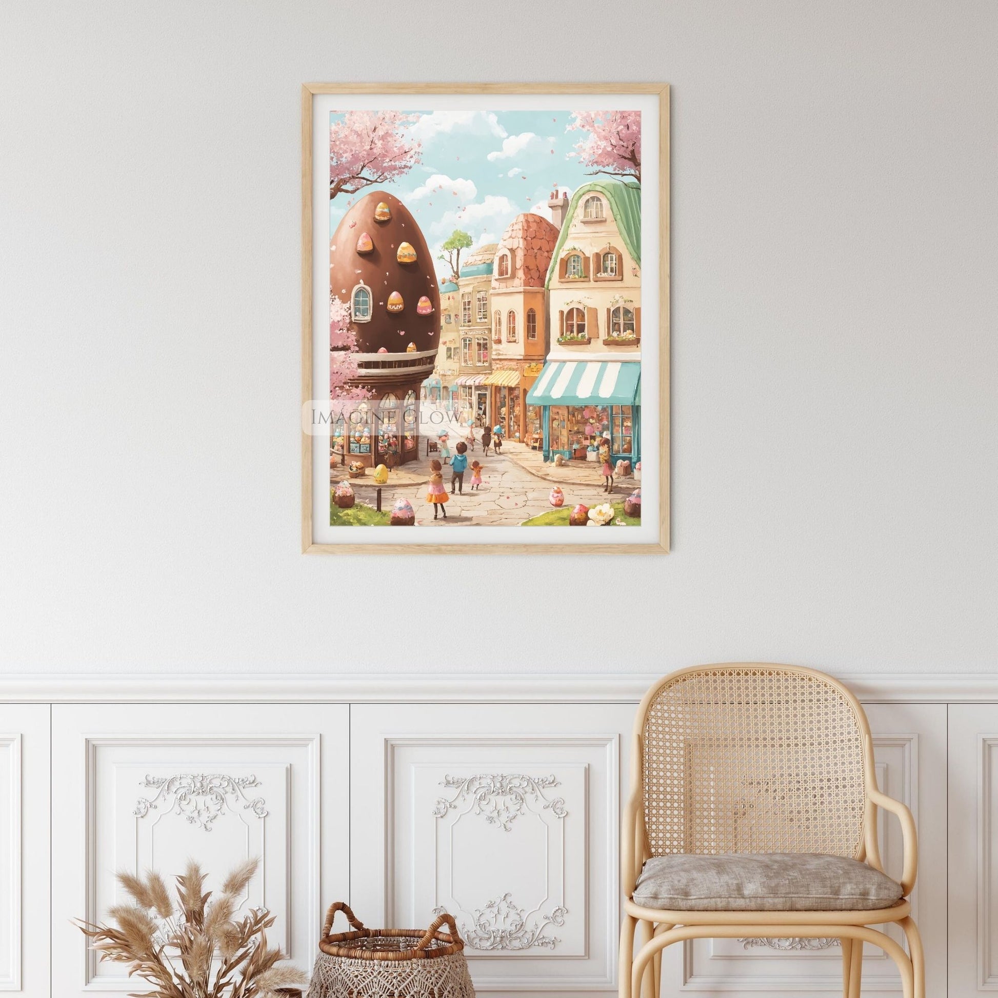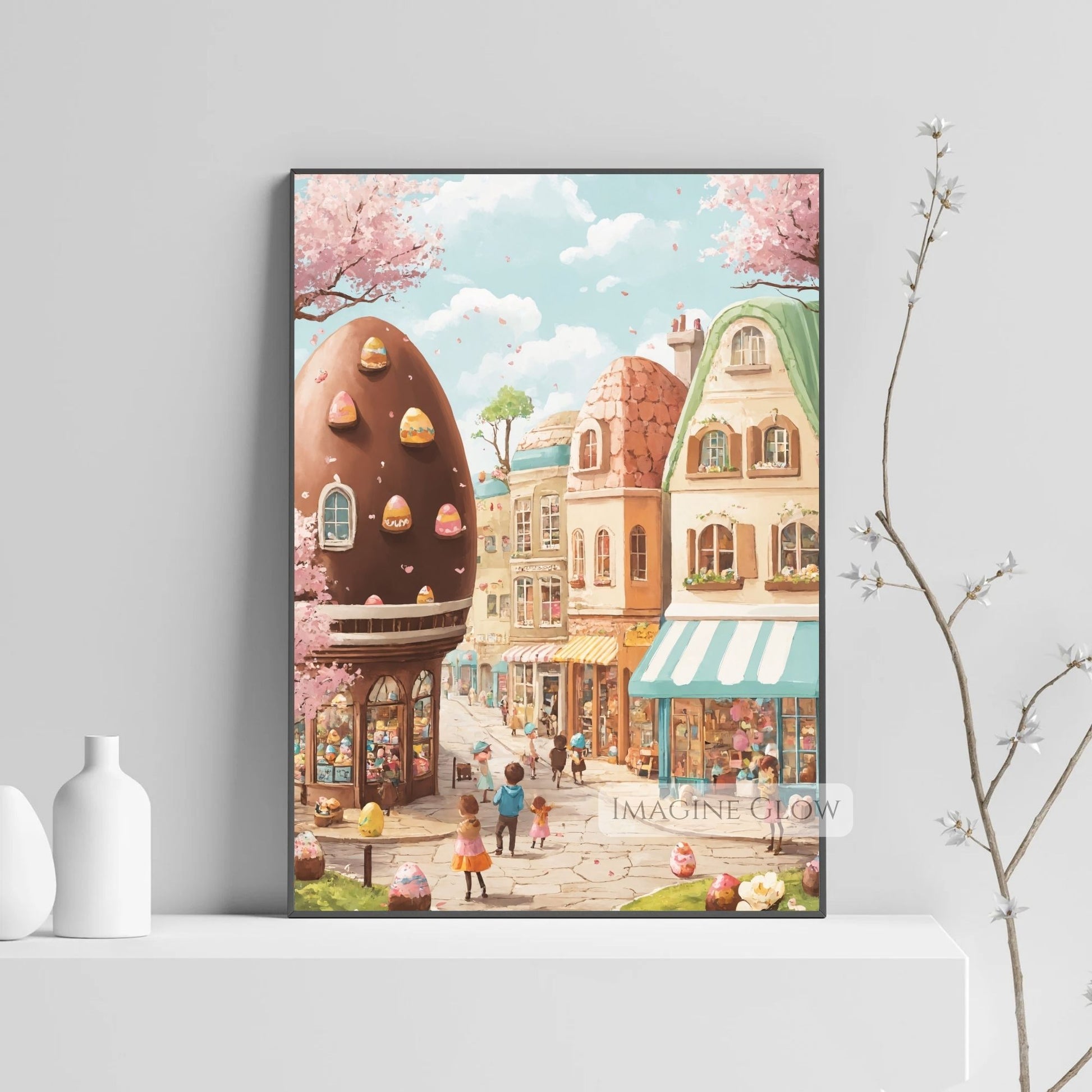 Easter Village Street Art Print – Chocolate Eggs & Blooming Cherry Blossoms Wall Art