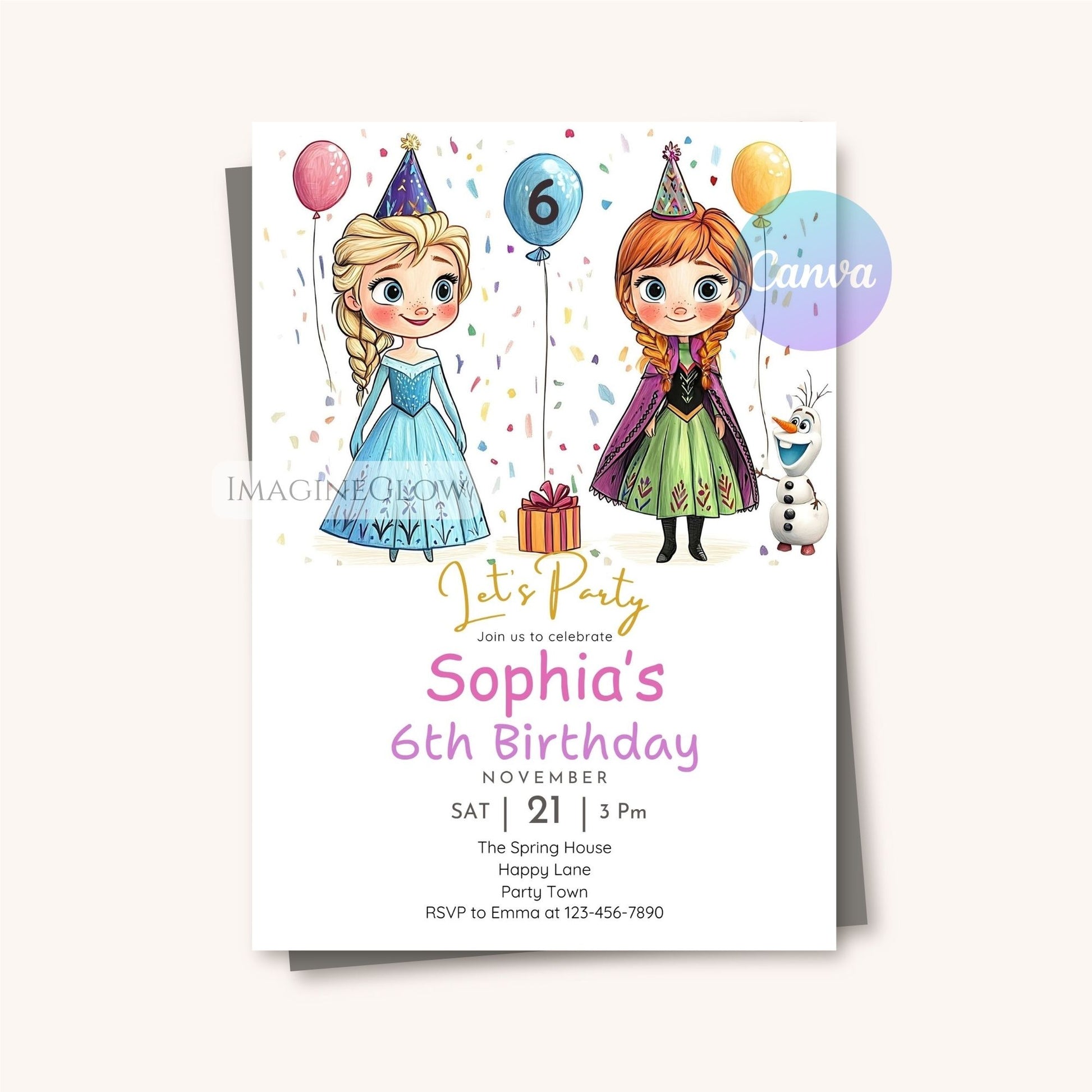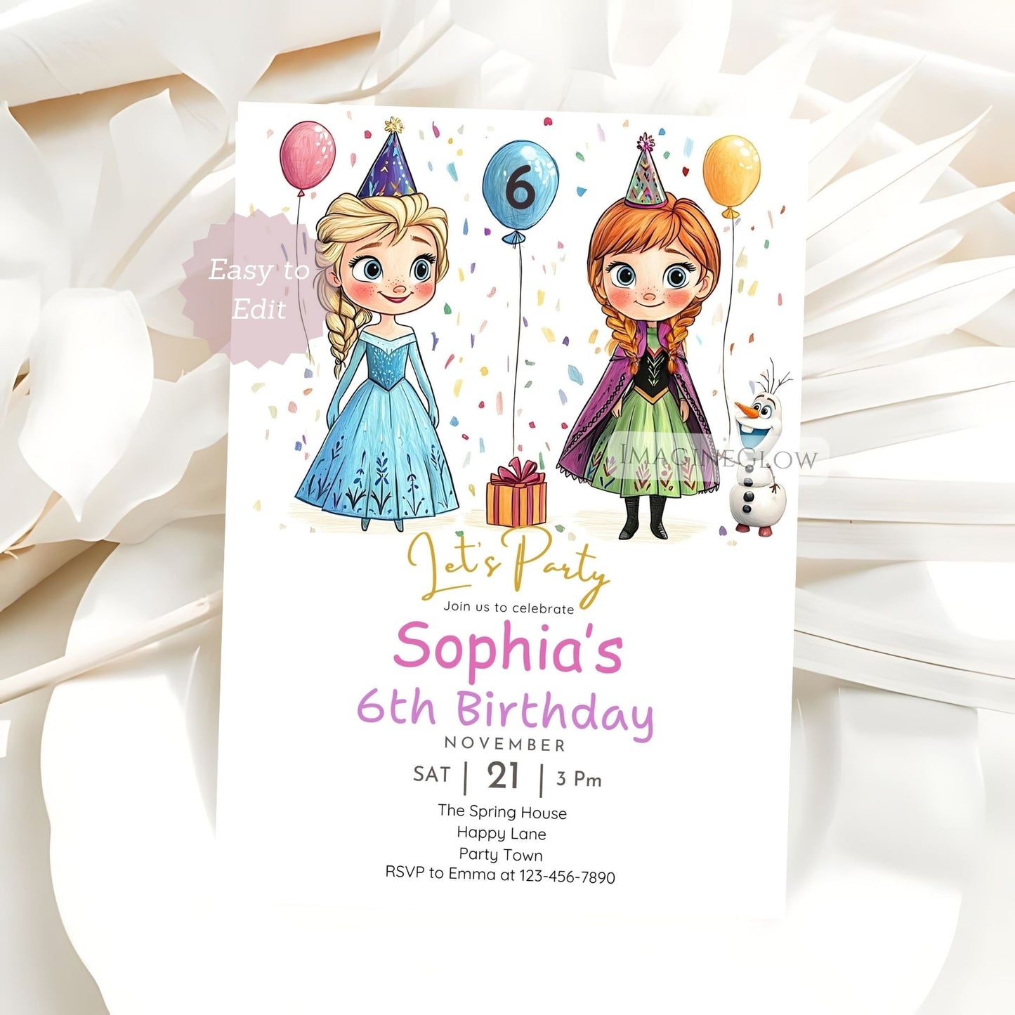 Celebrate a magical winter wonderland with this Frozen Birthday Invitation featuring Elsa and Anna! Designed for fans of the beloved Frozen films, this editable invite captures the spirit of adventure, sisterhood, and snowy fun.