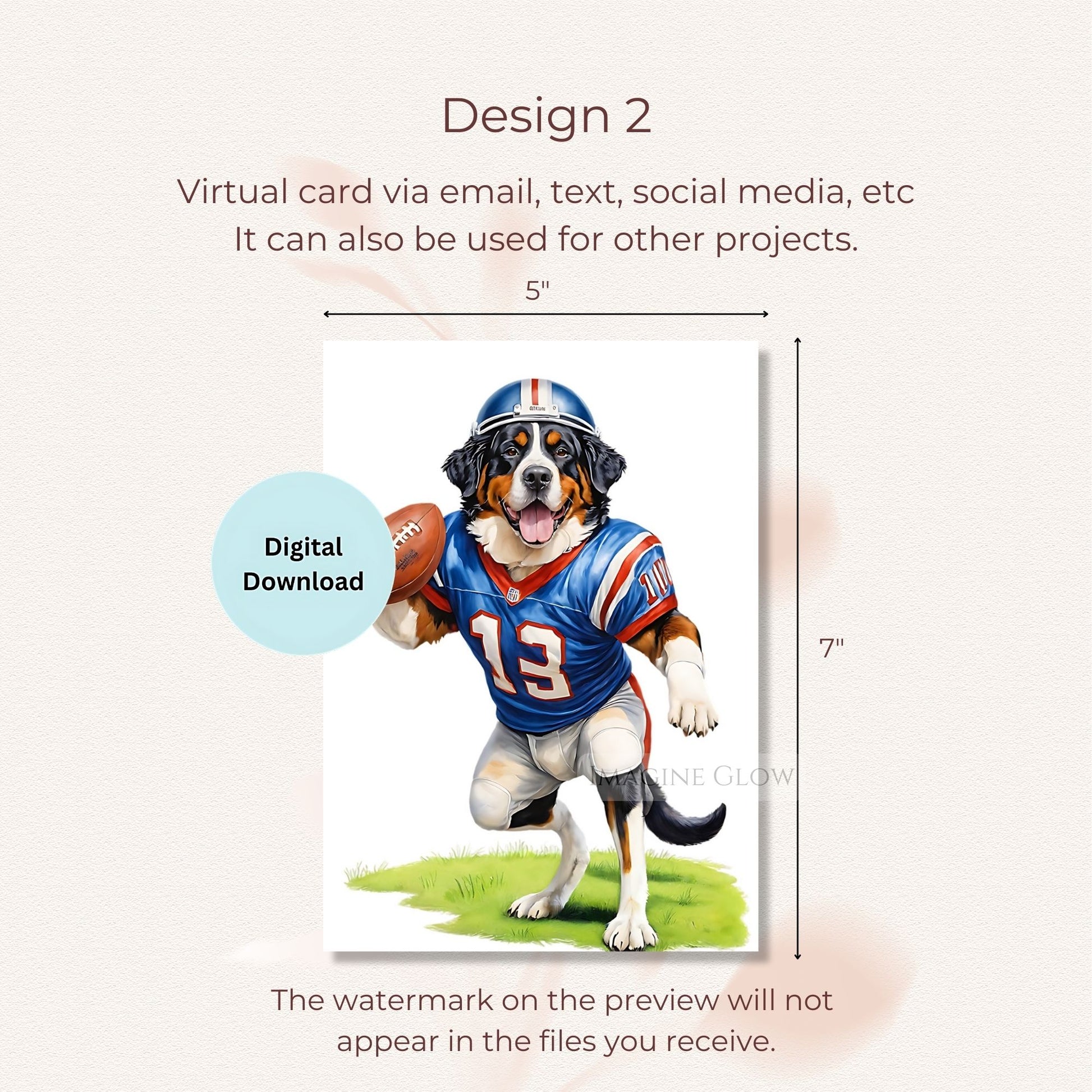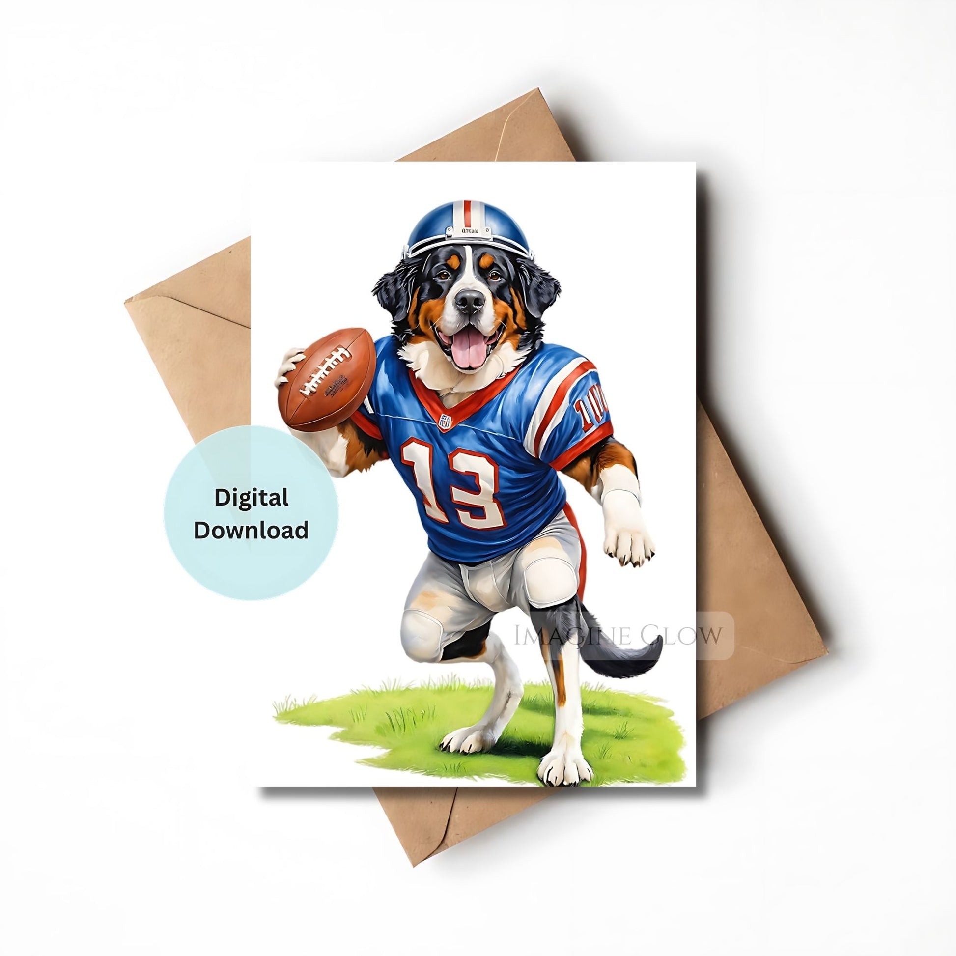 Celebrate special moments with this adorable Bernese Mountain Dog Football Card! Perfect for dog lovers and sports enthusiasts, this digital download features a playful Bernese Mountain Dog dressed in a football helmet and costume, adding joy and excitement to any occasion. Ideal for birthdays, game days, or any celebration, this printable card is suitable for all ages. Great for both kids and adults who love American football, this card makes a fun and unique gift!