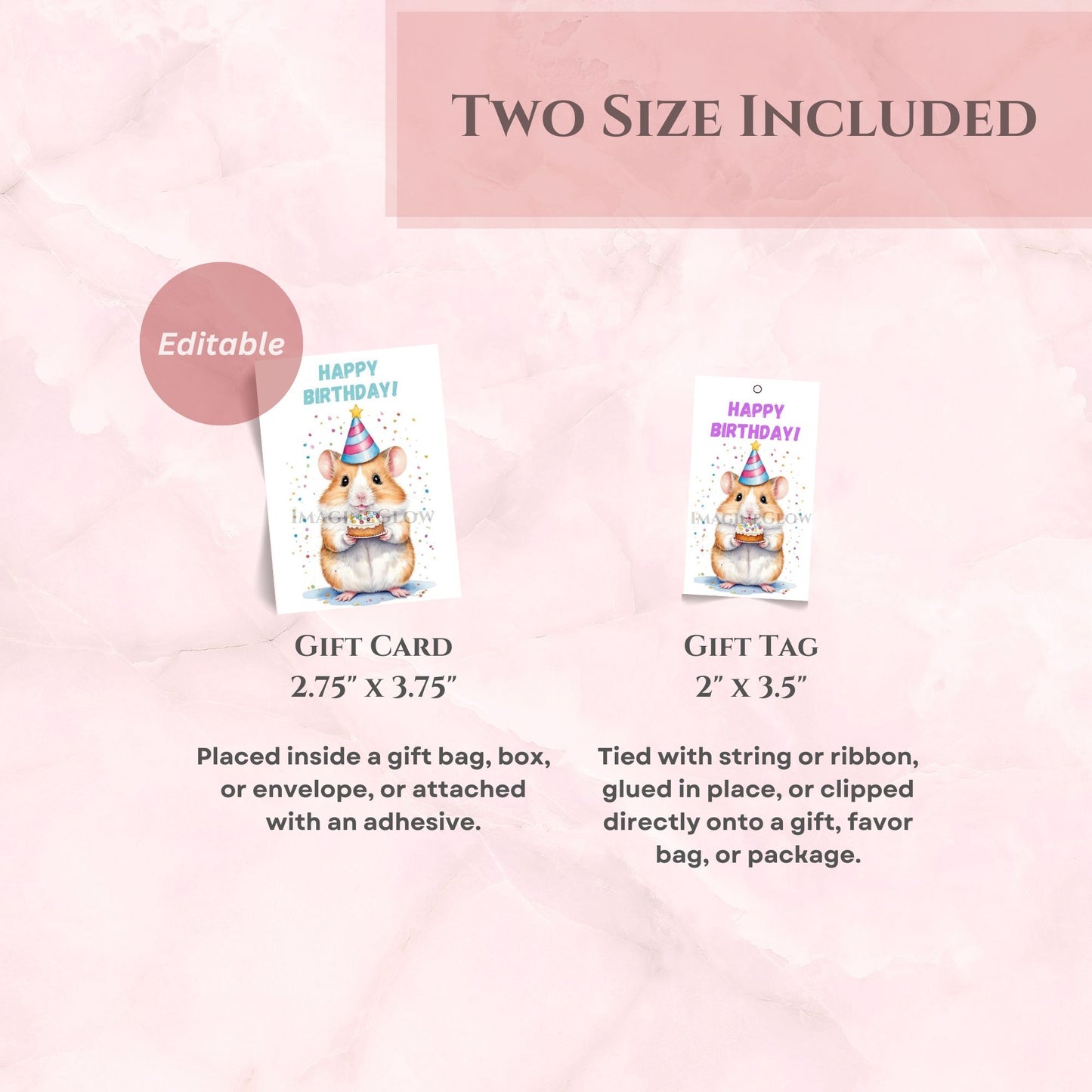 The set includes both a gift card and a matching gift tag, each featuring adorable hamster illustrations that are sure to put a smile on the recipient’s face. The cards are customizable, allowing you to add your personal message, making them perfect for birthdays, celebrations, or just because.