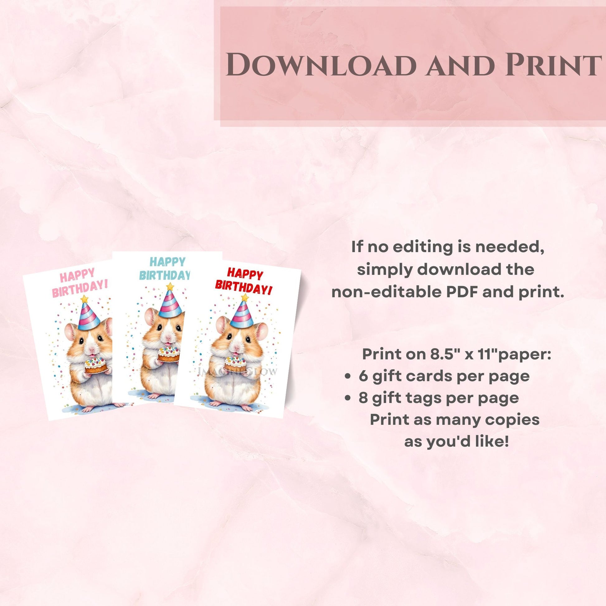 These hamster-themed gift cards and tags are ideal for kids, friends, family, and anyone who loves hamsters. Use them for party favors, wrapping gifts, or as cute additions to your hamster-themed birthday parties. These delightful gift cards and tags are the perfect way to show thoughtfulness and add a personalized touch to your presents.