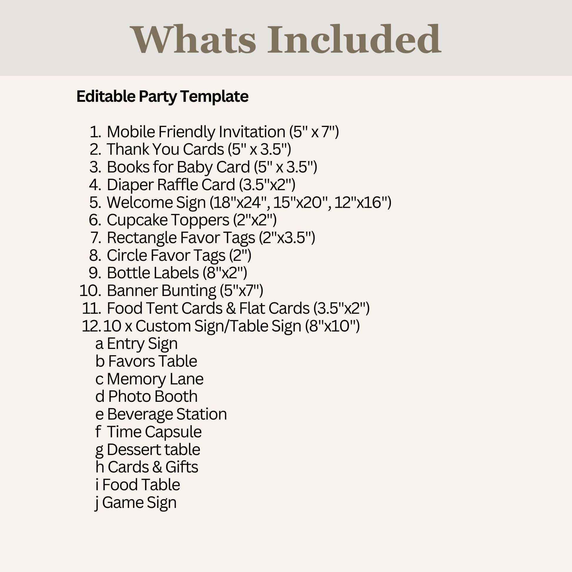 With instant access to your files, you can start planning your event right away. Impress your guests with coordinated decor, favor tags, bottle labels, banners, and even fun games like baby shower bingo. The welcoming signs and table decorations add a heartfelt touch, ensuring your shower is as memorable as it is beautiful.
