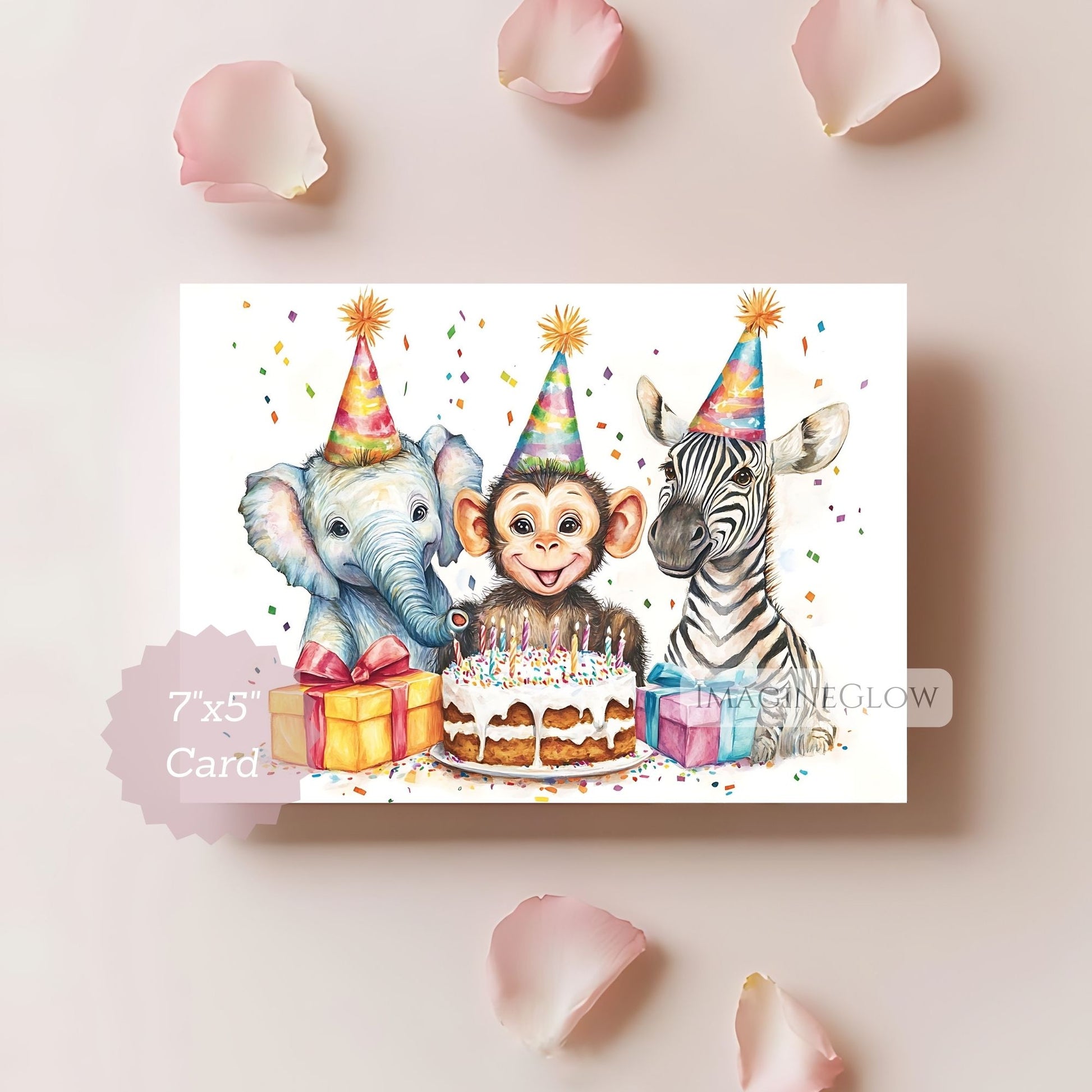 Jungle Safari Animal Birthday Card - Monkey Zebra Elephant Card