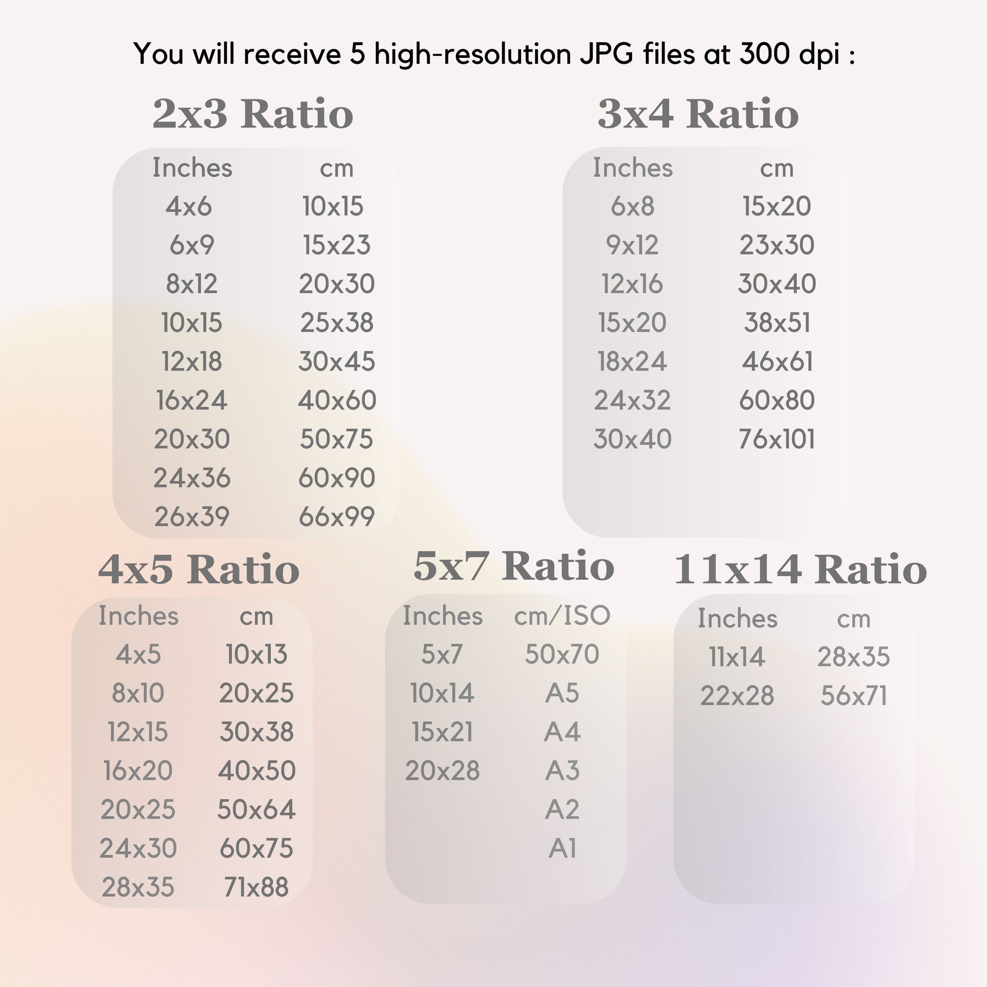 You will receive 5 high-resolution JPG files at 300 dpi in the following ratios: