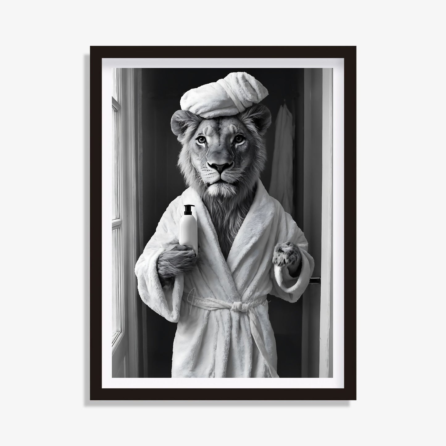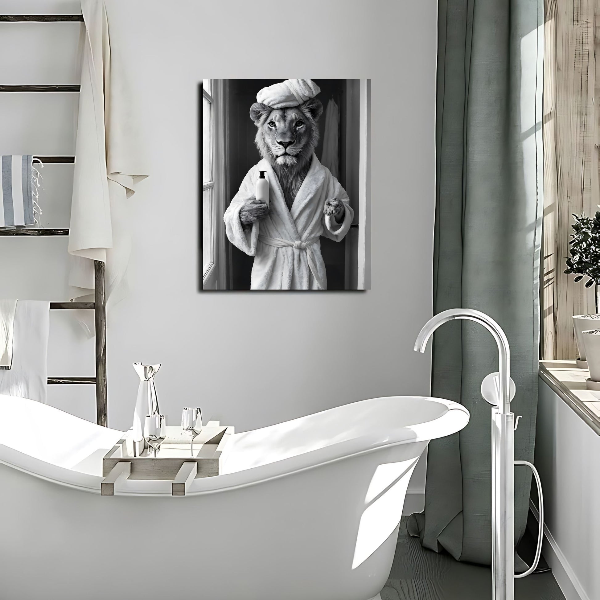 Add a playful touch to your bathroom with this lion print, perfect for fans of quirky animal humor. This black-and-white toilet poster features a whimsical lion taking a bath in a bathtub, making it ideal as bathtime art or restroom wall art. Use it as an above-toilet print or washroom decor to bring charm and fun to your space. This animal in tub design is a funny bathroom photo and makes for unique toilet wall decor. Whether you're redecorating or looking for a creative lion gift, this funny toilet art is sure to impress and add personality to your bathroom.