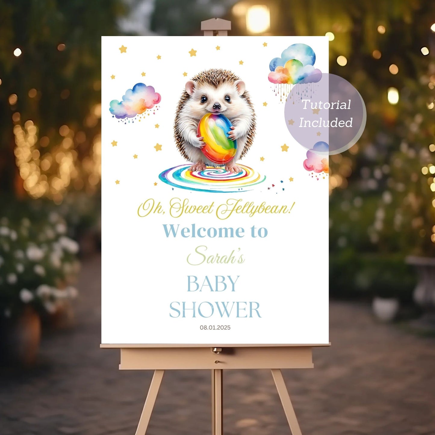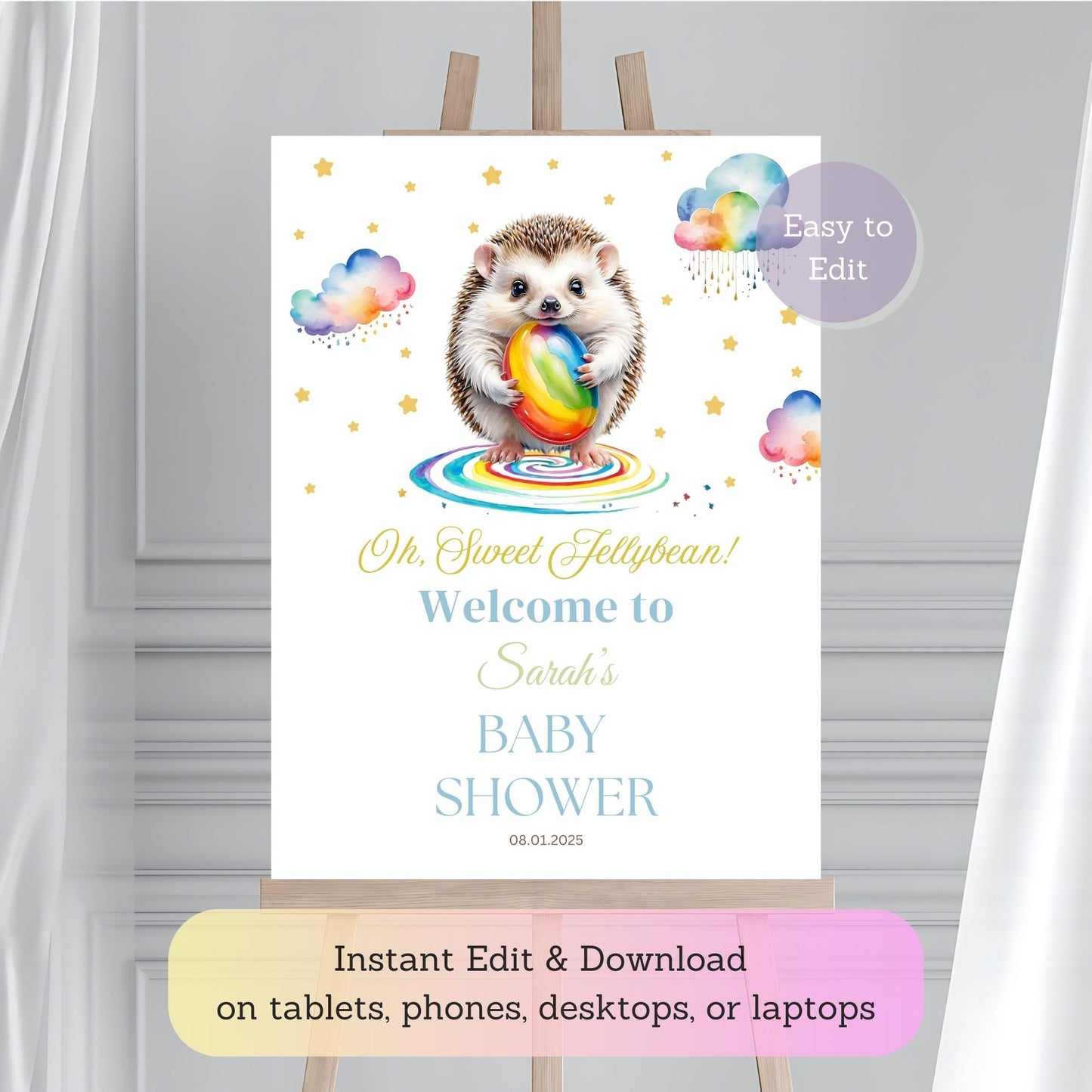 Little Jellybean Baby Shower Welcome Sign - Hedgehog First Birthday Poster - Editable Sweet-Themed Party Sign