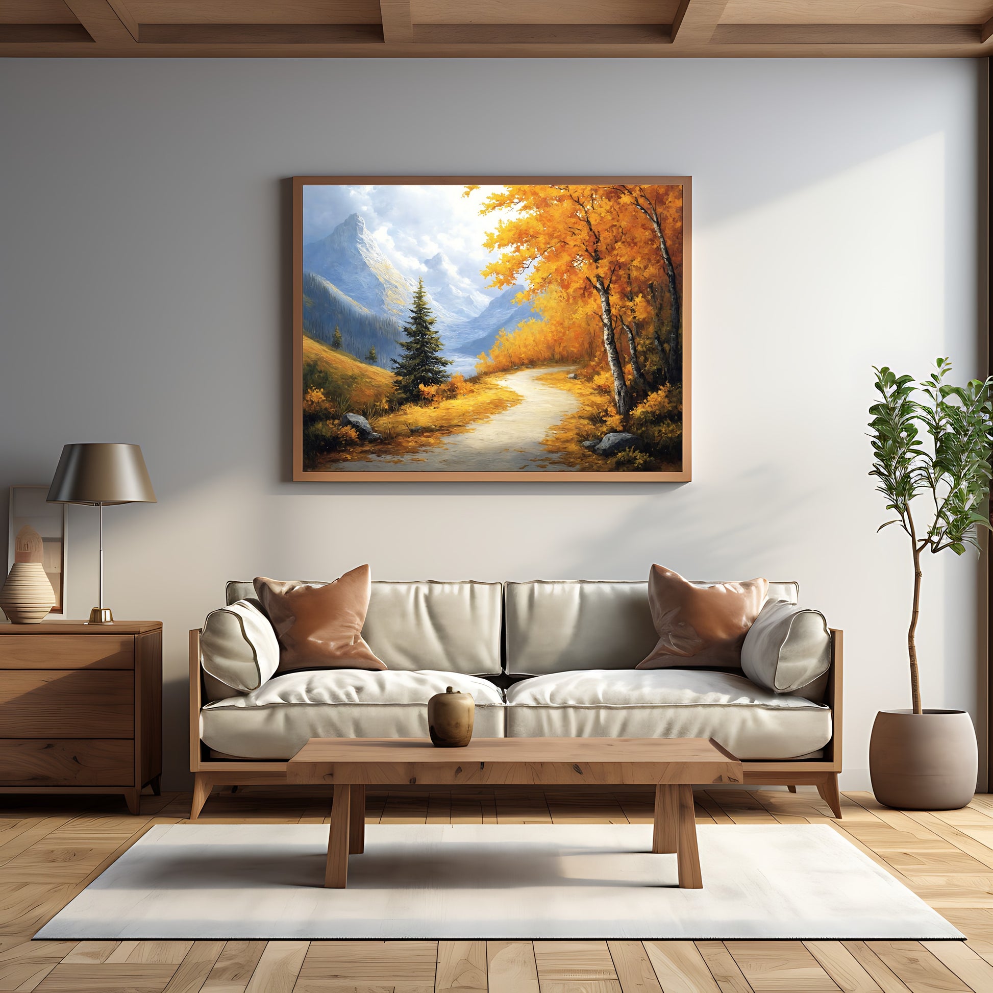 Embrace the beauty of the fall season with this "Mountain Path Landscape" autumn wall art. This printable artwork captures a scenic mountain path adorned with rich autumn colors, creating a warm and rustic ambiance in any room. Perfect for living spaces, bedrooms, or hallways, this piece brings the tranquil charm of nature and the cozy feel of autumn to your home decor.