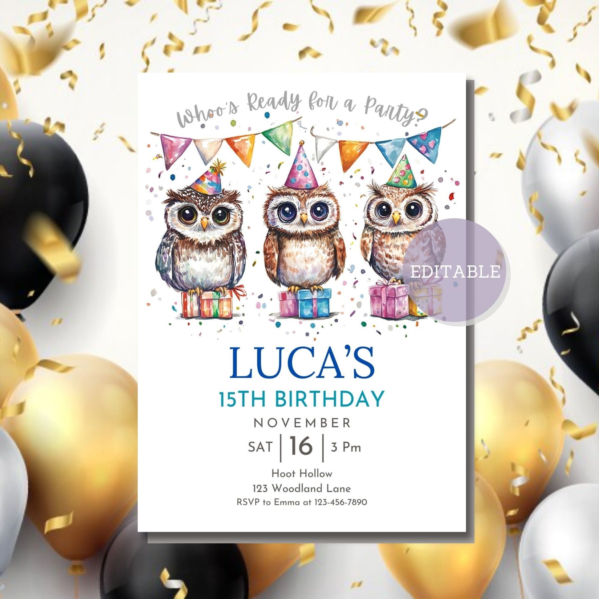Owls Birthday Invitation Template - Editable Party Invite - Printable Canva Design