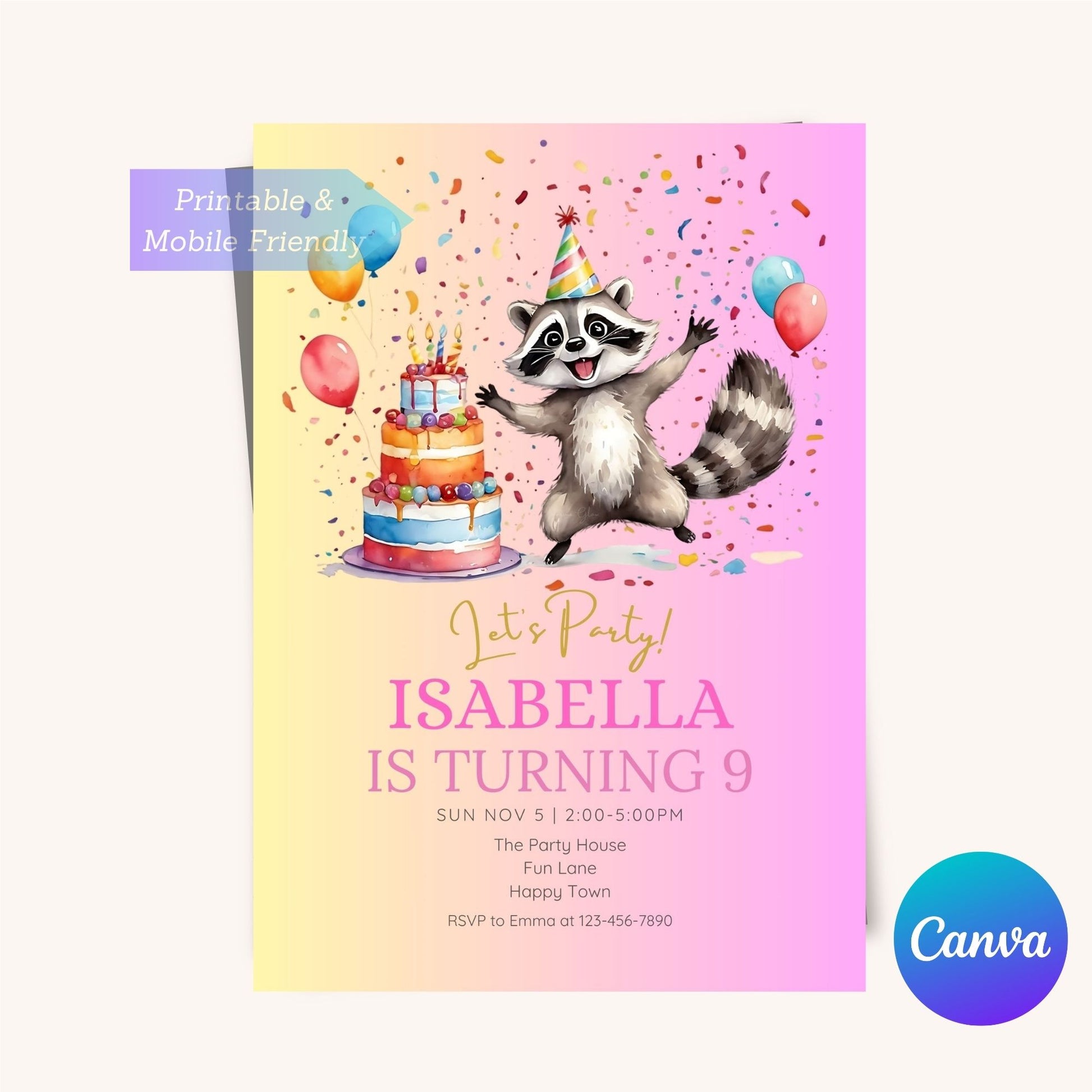 Raccoon Birthday Invitation - Cute Animal Party Invite