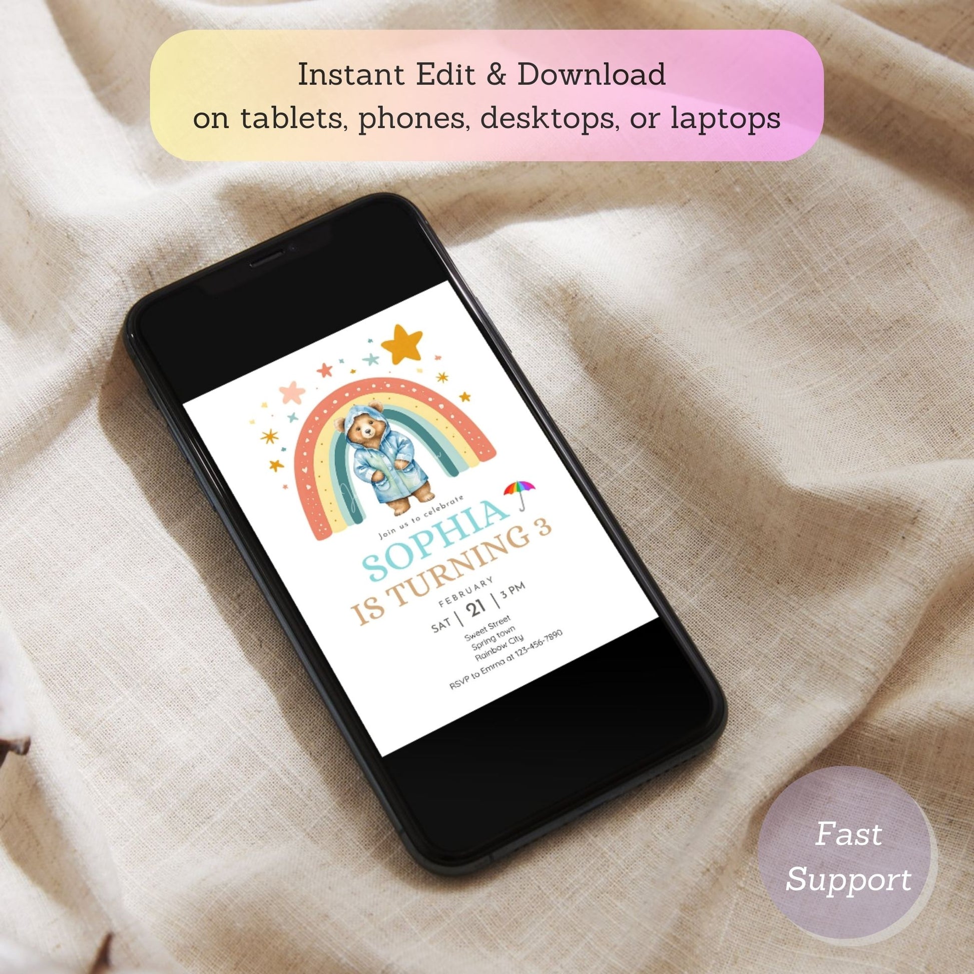 Rainbow Boho Invitation - Spring Party Invite - Bear Theme Fun Birthday Invite