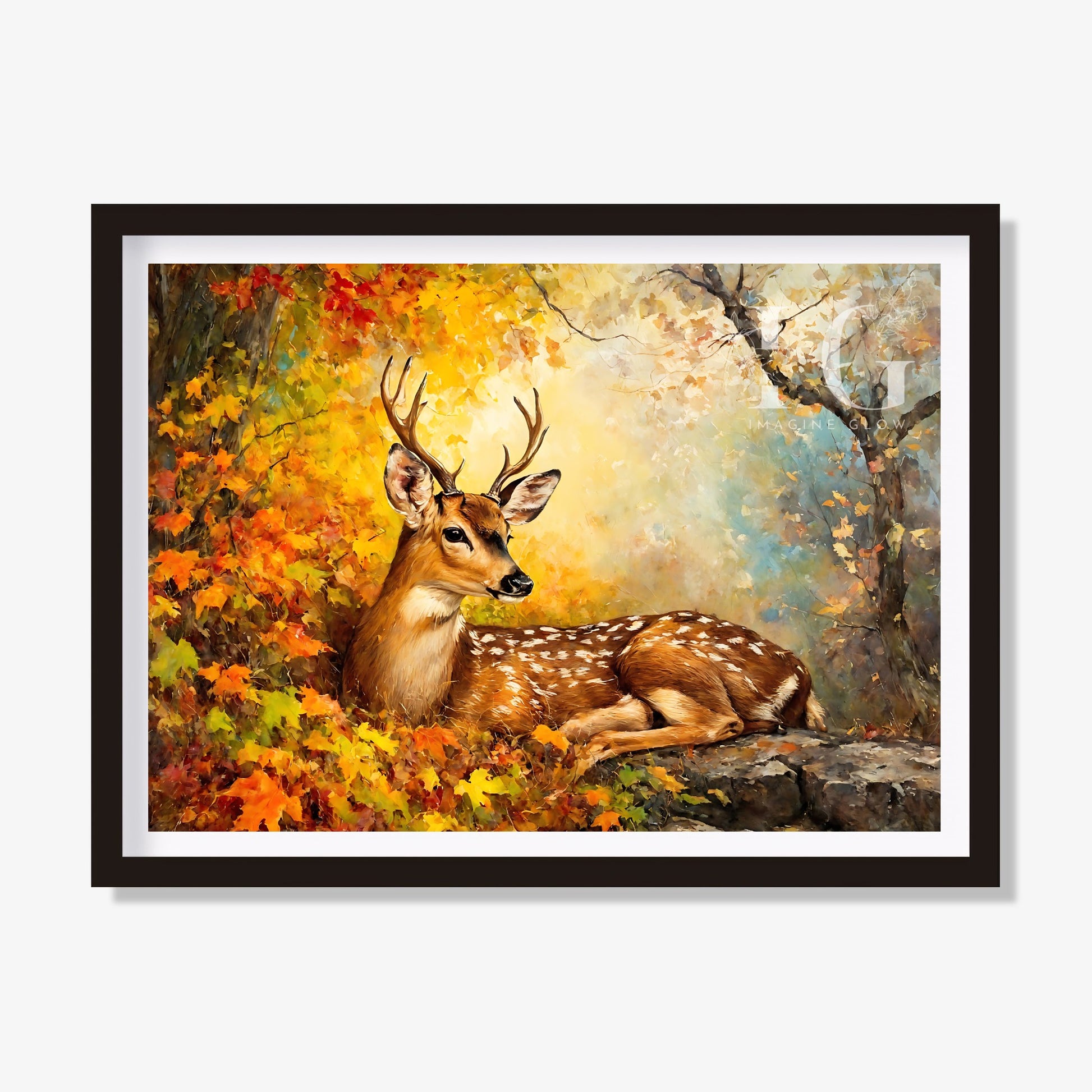 Bring the beauty of autumn and wildlife into your home with this "Reindeer in Forest" wall art. This printable piece showcases a majestic reindeer in a forest surrounded by vibrant fall foliage, creating a peaceful and serene atmosphere. Perfect for adding seasonal charm and nature-inspired elegance to your living room, bedroom, or entryway.