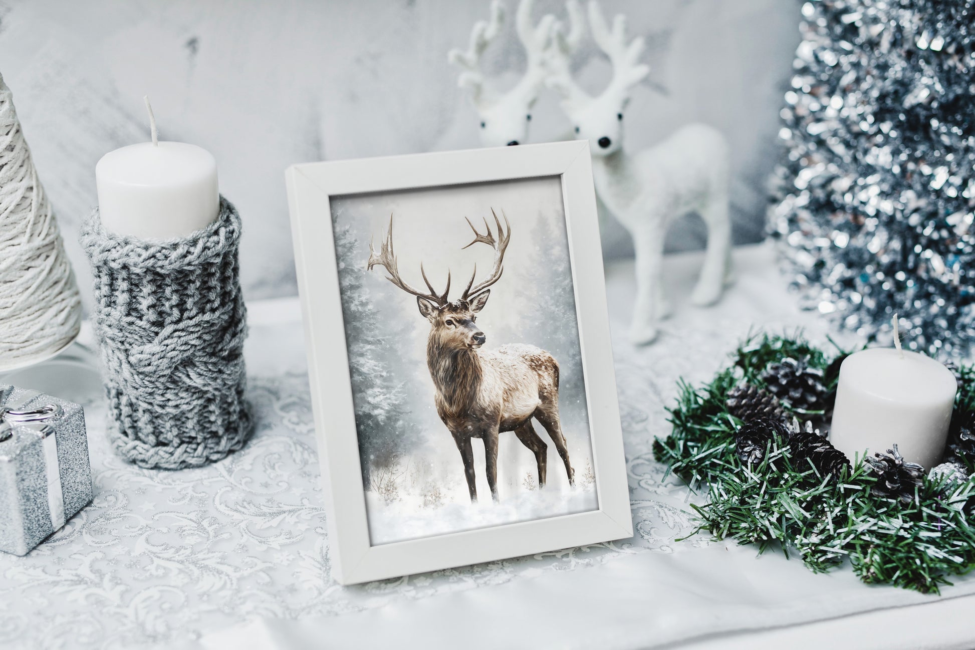 Bring the serene beauty of winter to your home with this "Reindeer in Snowy Forest Art Print." This printable winter wall decor captures a peaceful reindeer surrounded by a tranquil, snow-covered forest, evoking the magic of the holiday season. Perfect for adding festive charm and nature-inspired elegance to your space, this artwork is ideal for creating a cozy, seasonal atmosphere in your home.