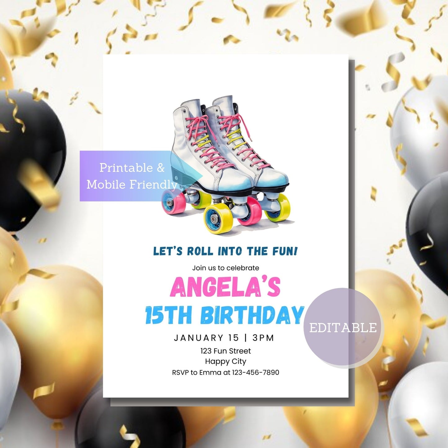Get ready to roll with this fun and vibrant roller skate-themed party invitation! Perfect for birthday celebrations, roller disco nights, or any retro-inspired event. This editable digital download template allows you to personalize the details effortlessly. Featuring a playful roller skate design and bold colors, it's sure to set the tone for an exciting gathering. Print at home or share digitally with your guests. A stylish and convenient way to invite everyone to the fun!