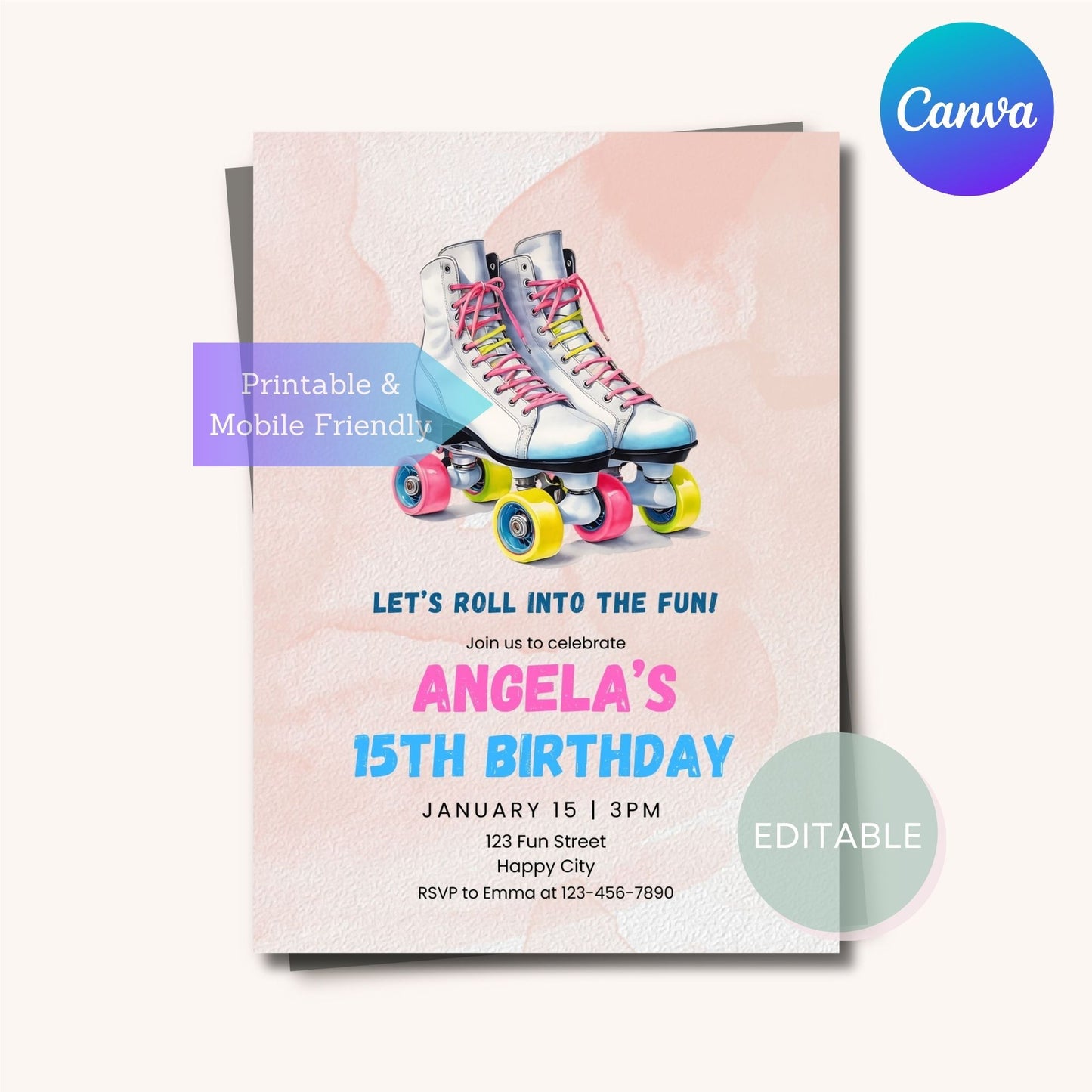 Roller Skate Birthday Party Invitation - Roller Disco Party Template - Customizable Printable Canva Design