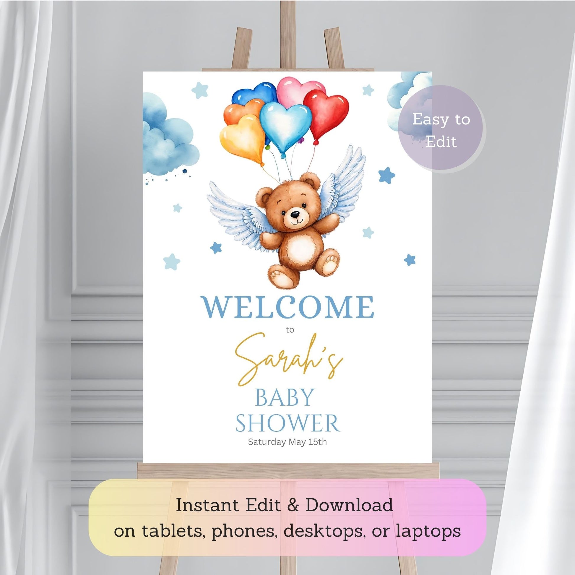 Welcome guests in style with this adorable Teddy Bear Baby Shower Welcome Sign, designed with angel balloons and a sweet bear illustration. Perfect for a gender-neutral baby shower, this editable template allows you to easily customize the text to fit your event. Whether you’re hosting a cozy indoor celebration or a festive outdoor gathering, this charming bear-themed poster will add a personal and whimsical touch to your party decor. It’s a must-have for welcoming your guests to a memorable baby shower.